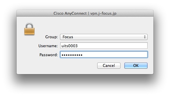 - 下記の画面が出力されたら、Groupを「Focus」、「Username」と「Password」を入力して「OK」ボタンを押します。